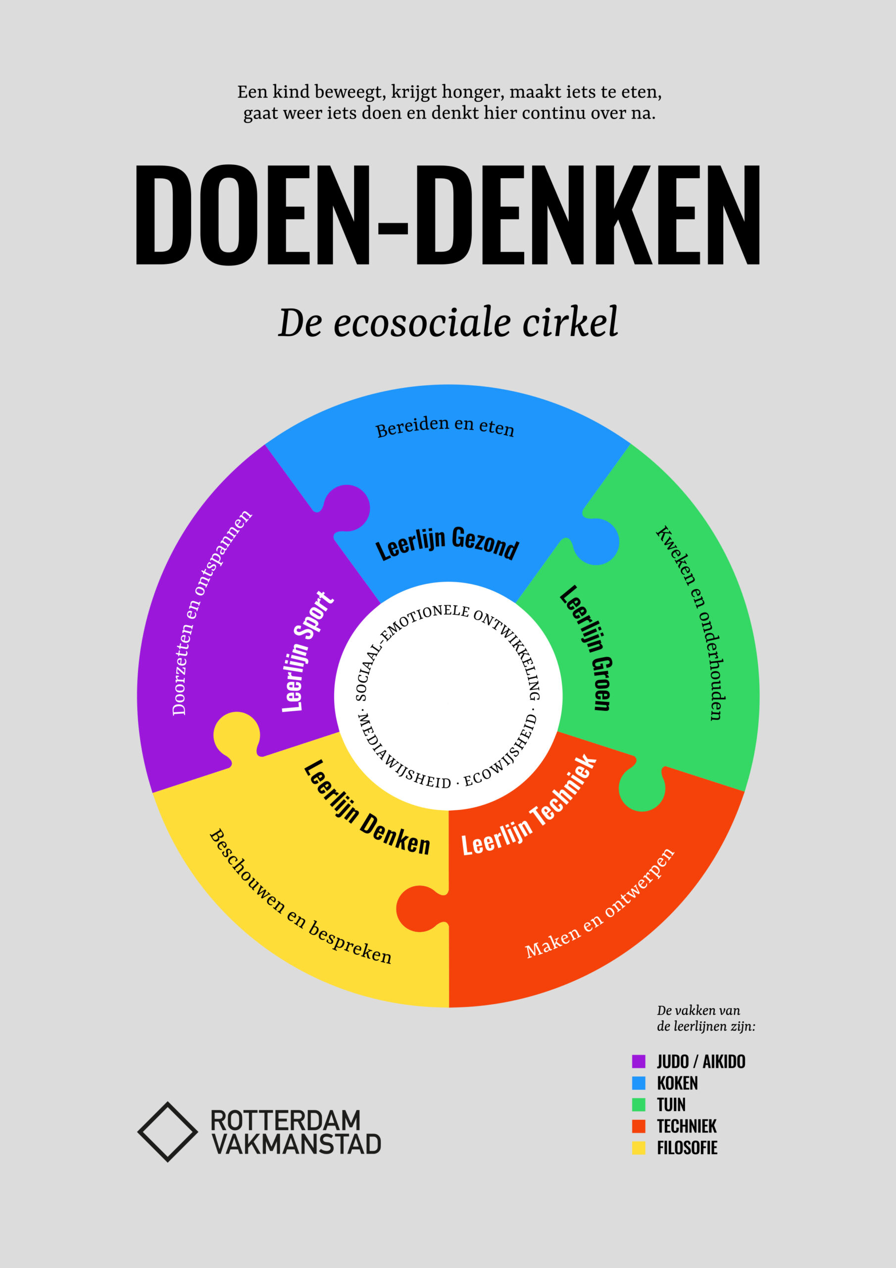 Duurzaam onderwijs begint bij het ontwerp van het lesprogramma. De ecosociale cirkel is de basis voor de levensechte leeromgeving die wij op Rotterdamse basisscholen creëren. De alledaagse context van de cirkel is omgezet in onze vijf vakken: judo en aikido, koken, tuinieren, techniek en filosofie. Wij focussen op de specifieke skills en kennisdoelen van deze vakken en werken daarmee aan mediawijsheid, ecowijsheid en sociaal-emotionele ontwikkeling. Zo kunnen leerlingen met Doen-denken al jong ervaring opdoen met duurzaam vakmanschap.